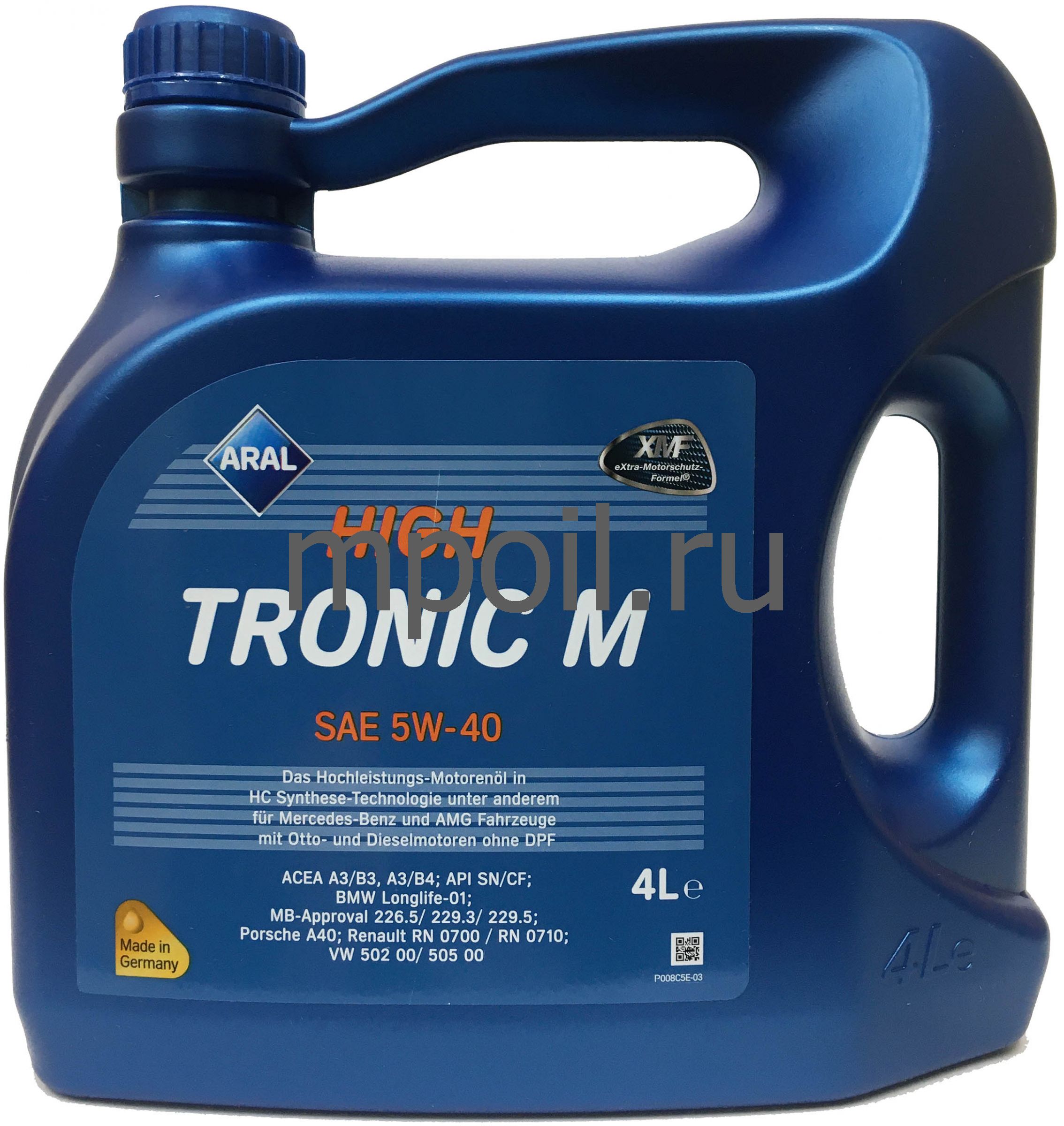 Aral HighTronic M 5W-40 - моторное масло высшего класса для бензиновых и дизельных двигателей, изготовленное с применением технологии Aral XMF. Соответствует последним требованиям BMW, GM, Mercedes-Benz, Porsche, Renault, VW.