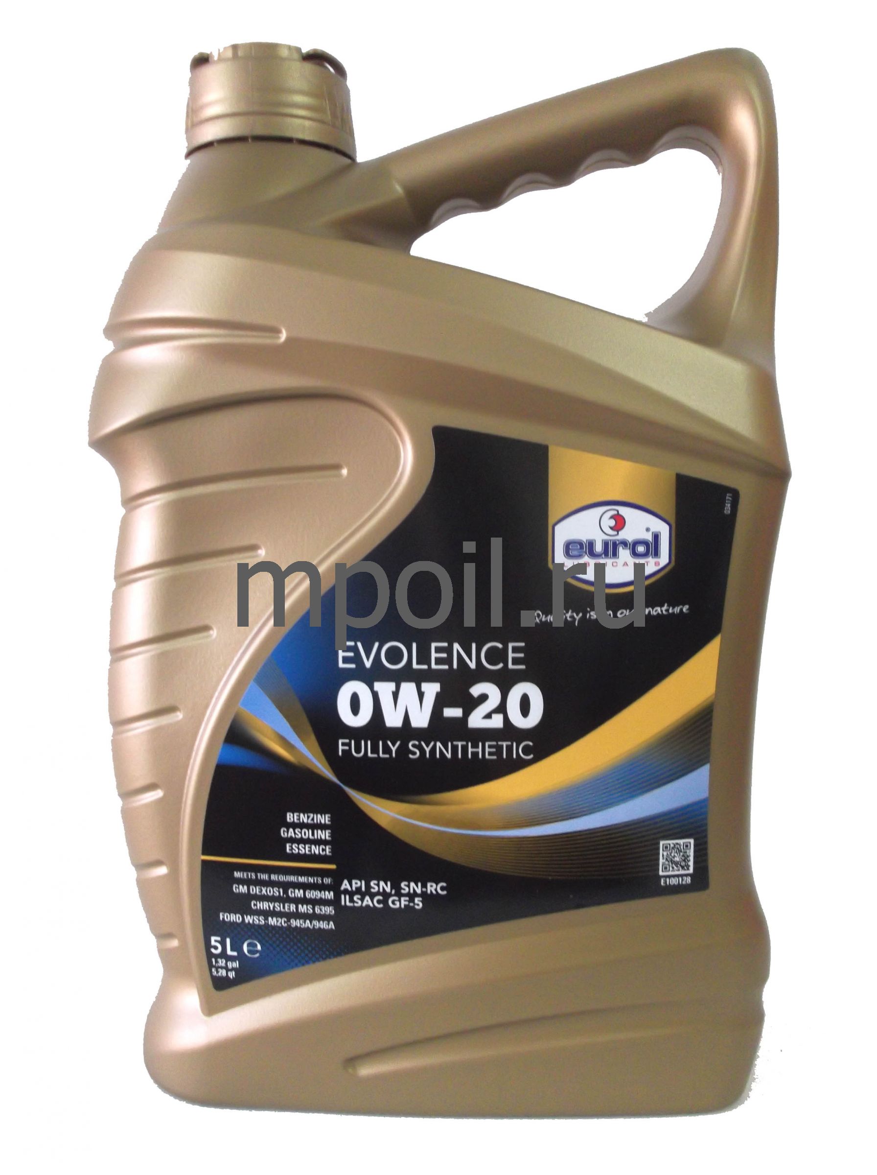 Eurol Evolence 0W-20 полностью синтетическое моторнное масло для бензиновых двигателей легковых автомобилей. Это масло может быть использовано в машинах, оснащенных каталитическими нейтрализаторами отработавших газов, двигателями с турбонаддувом и системами прямого впрыска, где требуется применение масел типа API SN/SN-RC (а также SJ, SL и SM) или ILSAC GF-5 (а также GF-2,-3 и -4).