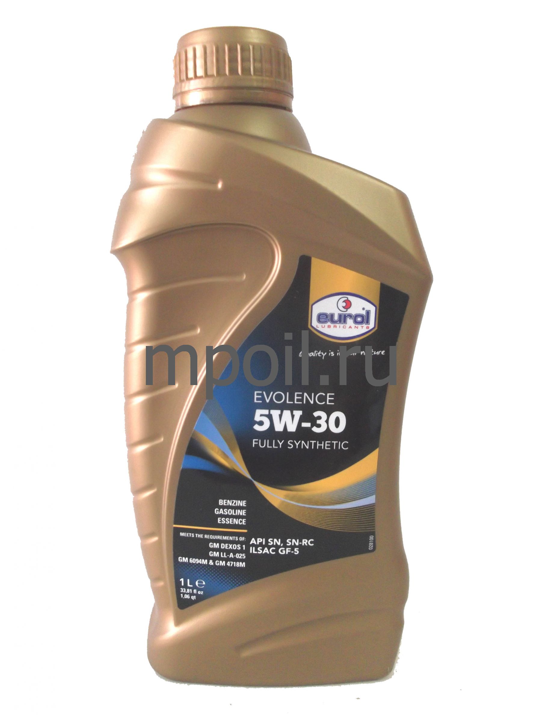 Eurol Evolence 5W-30 полностью синтетическое моторнное масло для бензиновых двигателей легковых автомобилей. Это масло может быть использовано в машинах, оснащенных каталитическими нейтрализаторами отработавших газов, двигателями с турбонаддувом и системами прямого впрыска, где требуется применение масел типа API SN/SN-RC (а также SJ, SL и SM) или ILSAC GF-5 (а также GF-2,-3 и -4).