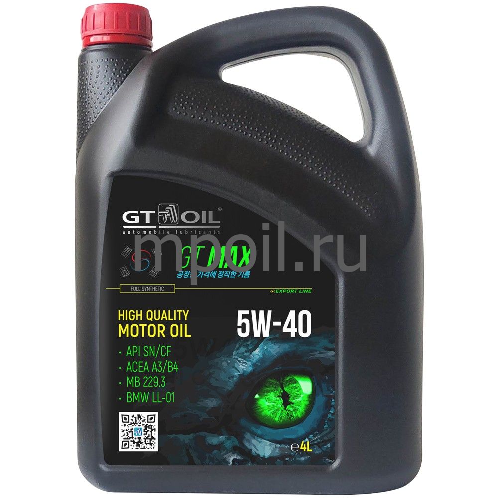 Моторное масло GT OIL Max SAE 5W-40 API SN/CF, 1 л 8809059409008 - высококачественное полностью синтетическое моторное масло для современных высокофорсированных бензиновых и дизельных двигателей (с турбонаддувом и без) легковых автомобилей, внедорожников, микроавтобусов и легких грузовиков. Максимальная защита двигателя от износа в жестких условиях городского цикла и в условиях повышенных нагрузок. Высокое содержание нейтрализующих присадок позволяет использовать топливо с повышенным содержанием серы (до 500 ppm).