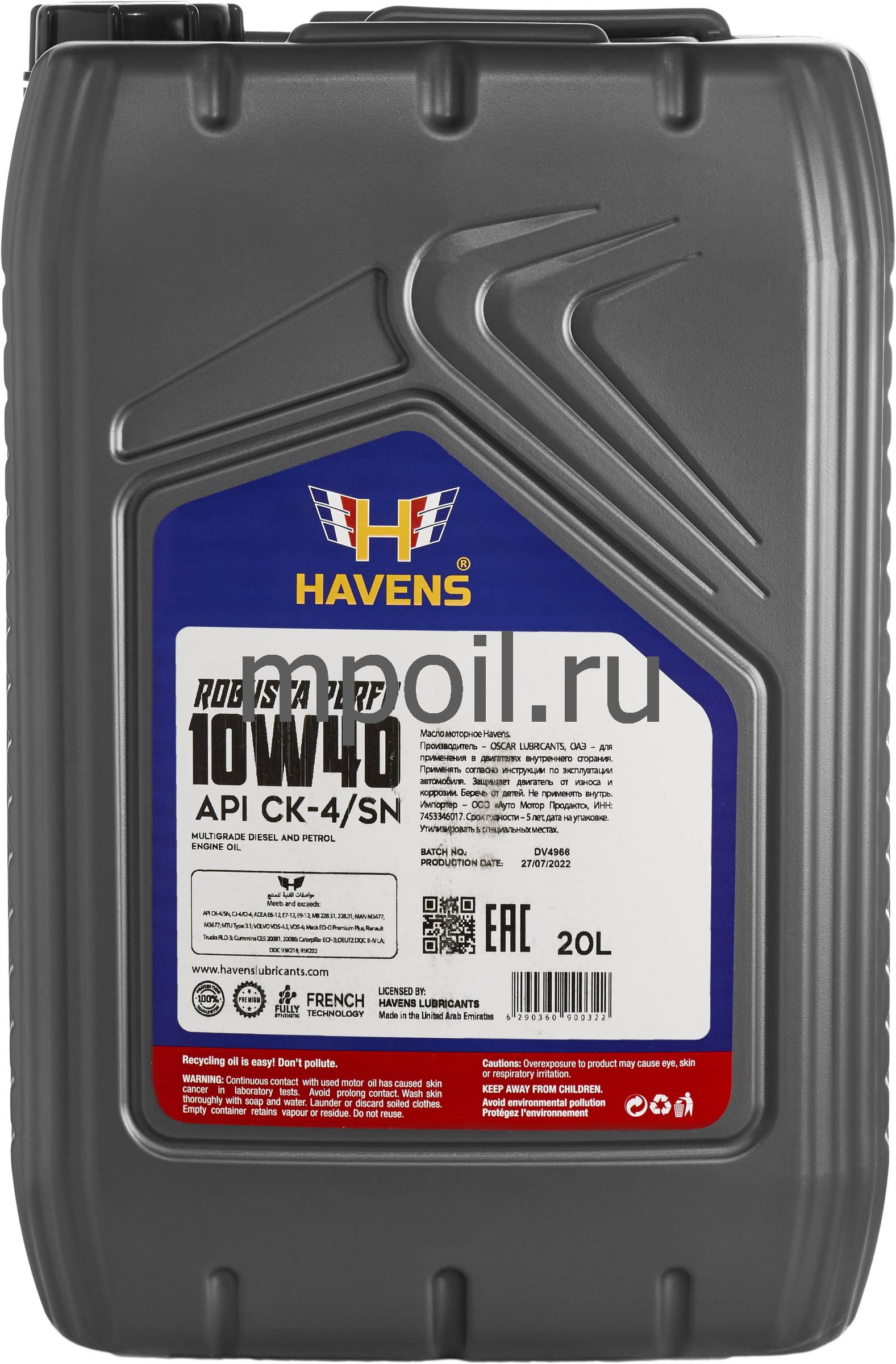 Технические характеристики Масло Havens Robusta Perfo 10W40 CK-4/SN CJ-4 20л