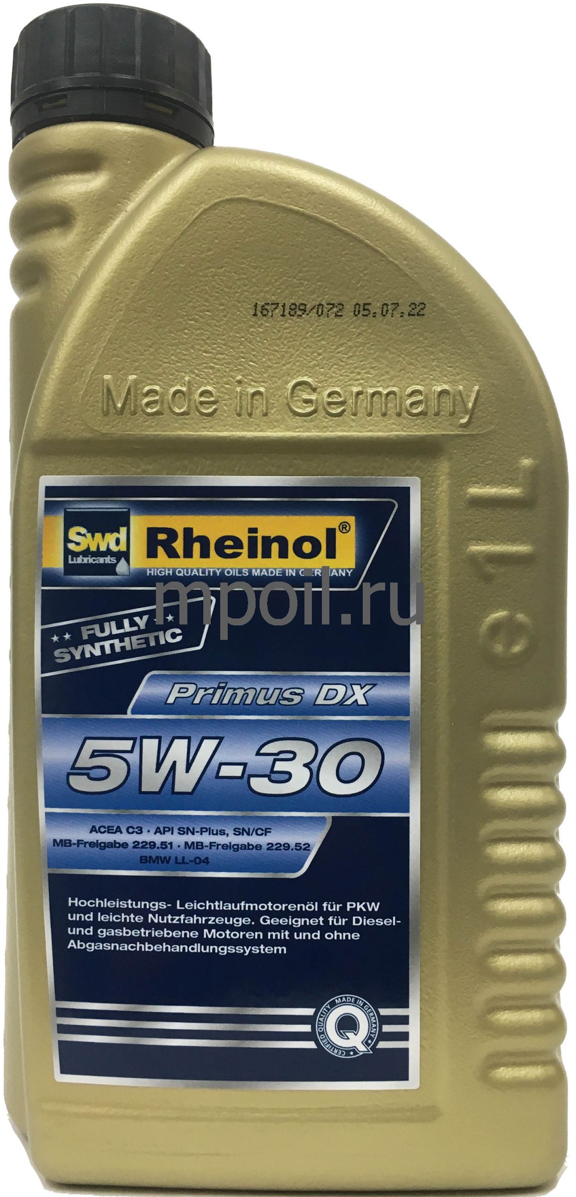 Swd Rheinol Primus DX 5W-30 - высокопроизводительное, легко-текучее моторное масло на основе технологии синтеза для бензиновых и дизельных двигателей с системой инжектора единицы (Pumpe-Düse-Einspritzsystem) и без неё, а также для двигателей работающих на природном газе.