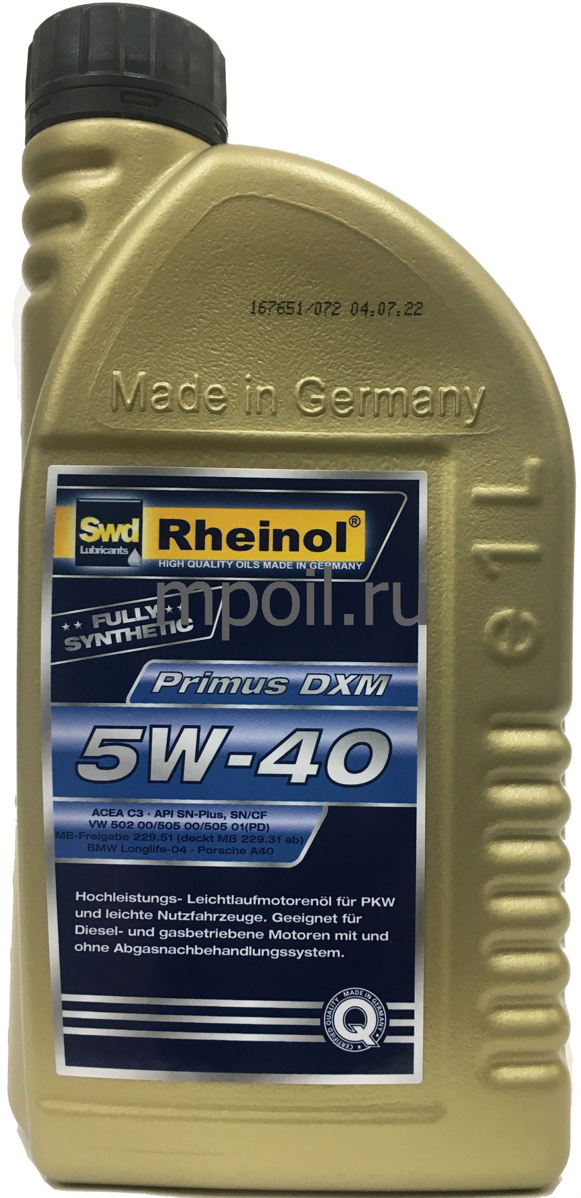 SwdRheinol Primus DXM 5W-40 - высокопроизводительное моторное масло с низким уровнем сульфатной зольности, фосфора и серы, благодаря новой технологии присадок «Low SAP». Для двигателей с системой обработки выхлопных газов (катализатор, сажевый фильтр DPF) и без неё.