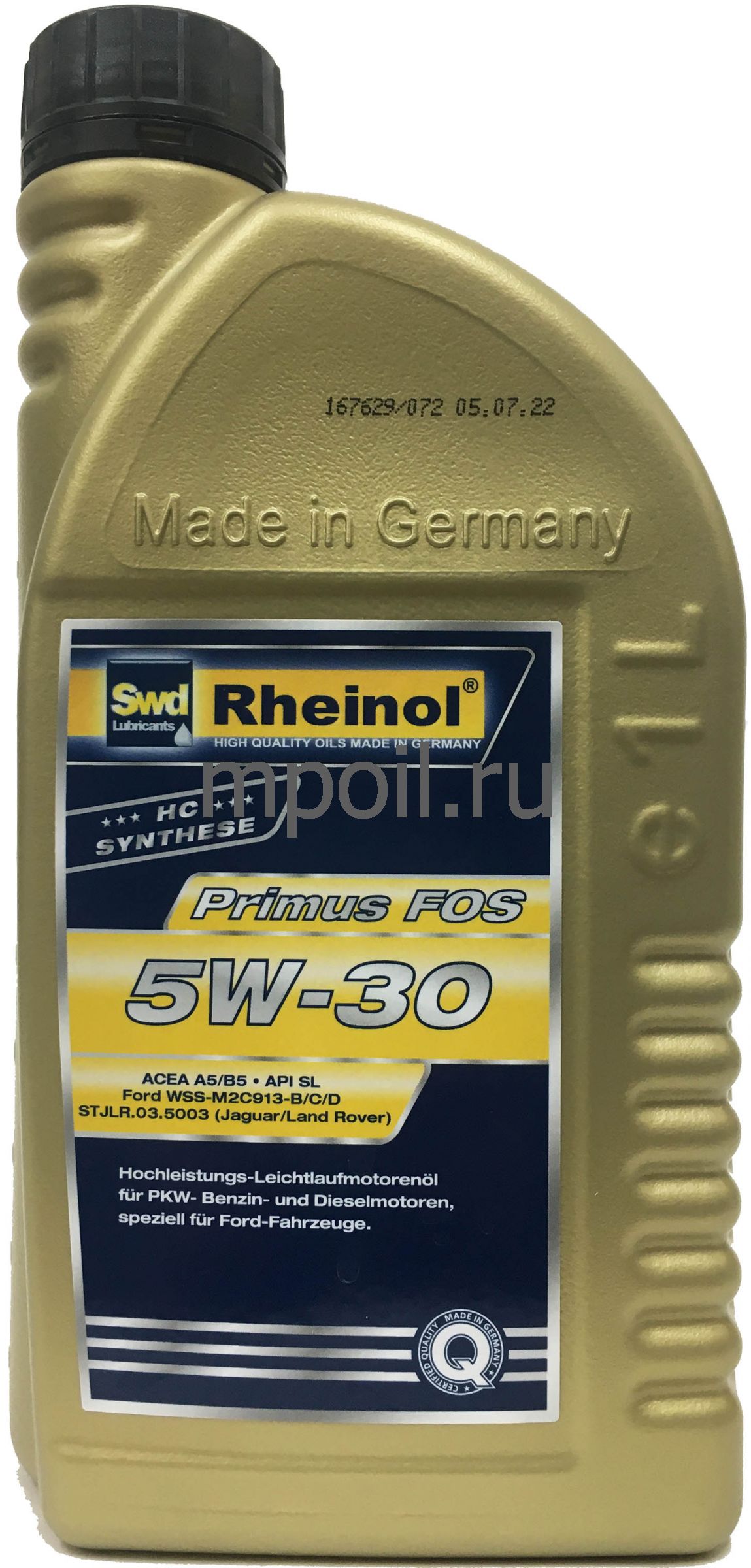 SwdRheinol Primus FOS 5W-30 - испытано в условиях самых экстремальных тепловых и механических нагрузок, которые могут возникнуть при эксплуатации двигателей современных автомобилей для которых предписано использование масел "Fuel Economy Oil". Рекомендуется для двигателей автомобилей марки "FORD".