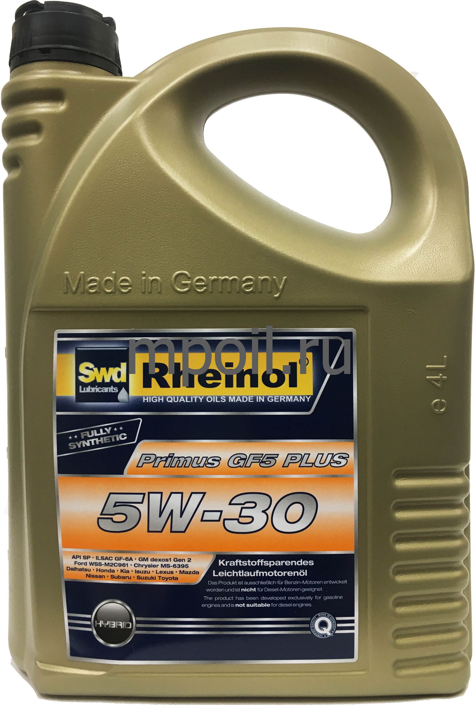 Swd Rheinol Primus GF5 Plus 5W-30 - синтетическое, на основе гидрокрекинга (HC), моторное масло для самых современных бензиновых двигателей легковых автомобилей и лёгкой коммерческой техники. Специально разработано для "даунсайзинг-двигателей" (двигатели внутреннего сгорания, в которых производители уменьшают рабочий объем без ухудшения характеристик). Специальная комбинация базовых масел и присадок предотвращает преждевременное воспламенение смеси в цилиндре (LSPI - Low Speed Pre Ignition).