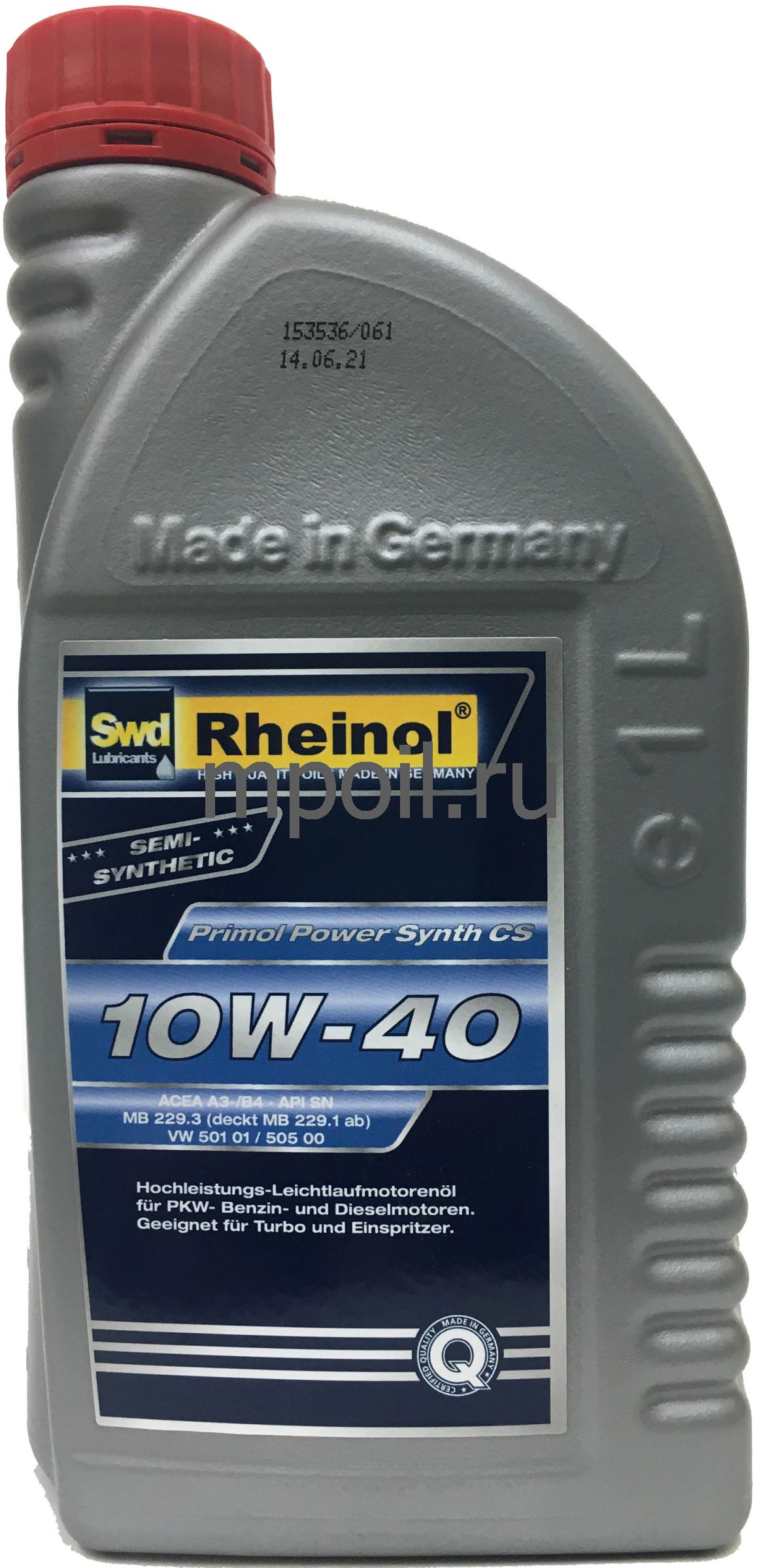 Swd Rheinol Primol Power Synth. CS 10W-40 - высококачественное всесезонное полусинтетическое моторное масло для бензиновых и дизельных двигателей легковых автомобилей. Данное масло производится из синтетических и минеральных компонентов базовых масел в комбинации с высокотехнологичными присадками. Масло может использоваться при самых больших нагрузках, как в современных бензиновых и дизельных двигателях (с турбонадувом и без него) легковых автомобилей, также и в двигателях легкой коммерческой техники.